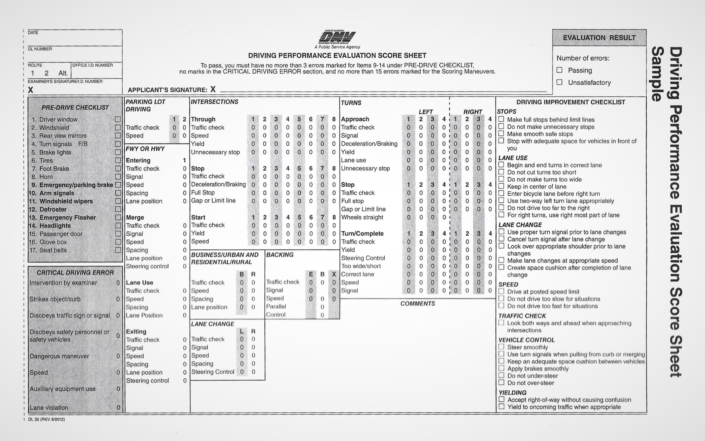 In order to get a Driver License, you have to pass DMV Driving Test which is also known as "Behind The Wheel Driving Test". Your DMV Driving Test will be based on the Driving Performance Evaluation Score Sheet. There are certain areas in this score sheet that you should never fail. You can see an actual score sheet below.