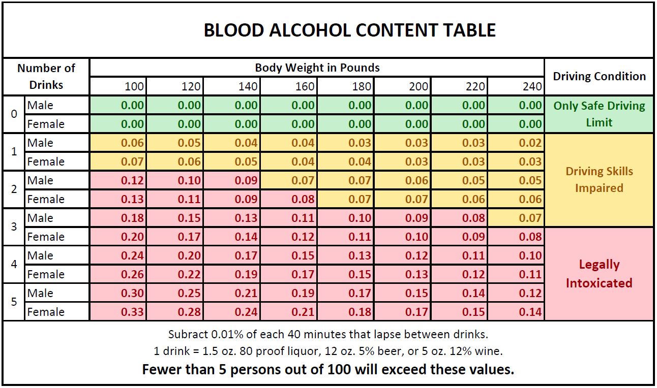 The table shows how alcohol effects drivers, based on gender and weight. Other than gender and weight, number and strength of drinks, the time period that you take the drink or certain medical conditions may affect the body. To be on the safe side, it is better not to drive a car even if you think that you drink in safe limits.